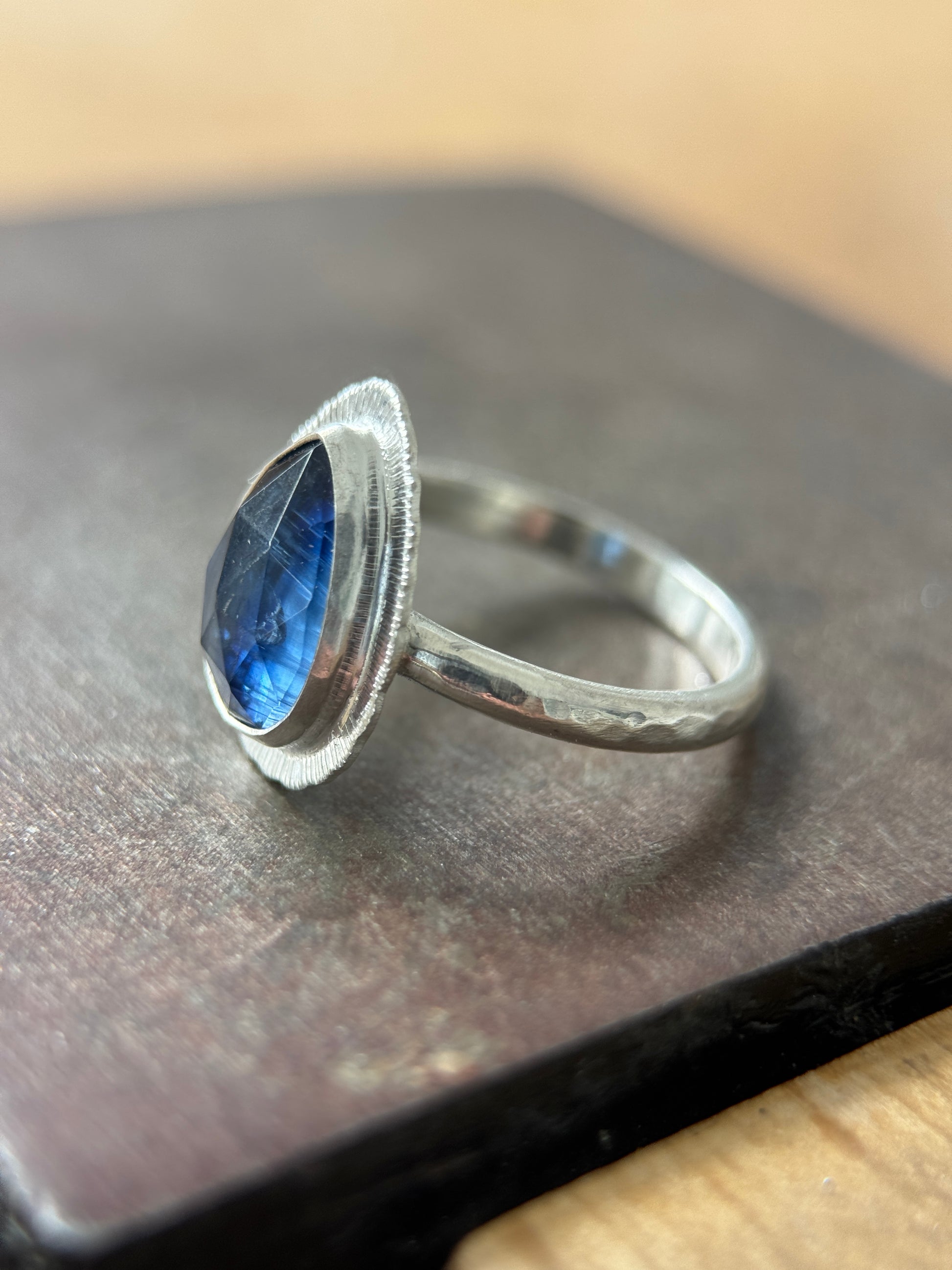 A beautiful rose cut, two tone, blue Kyanite, bezel set in an open back, sterling silver ring.