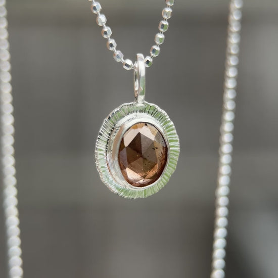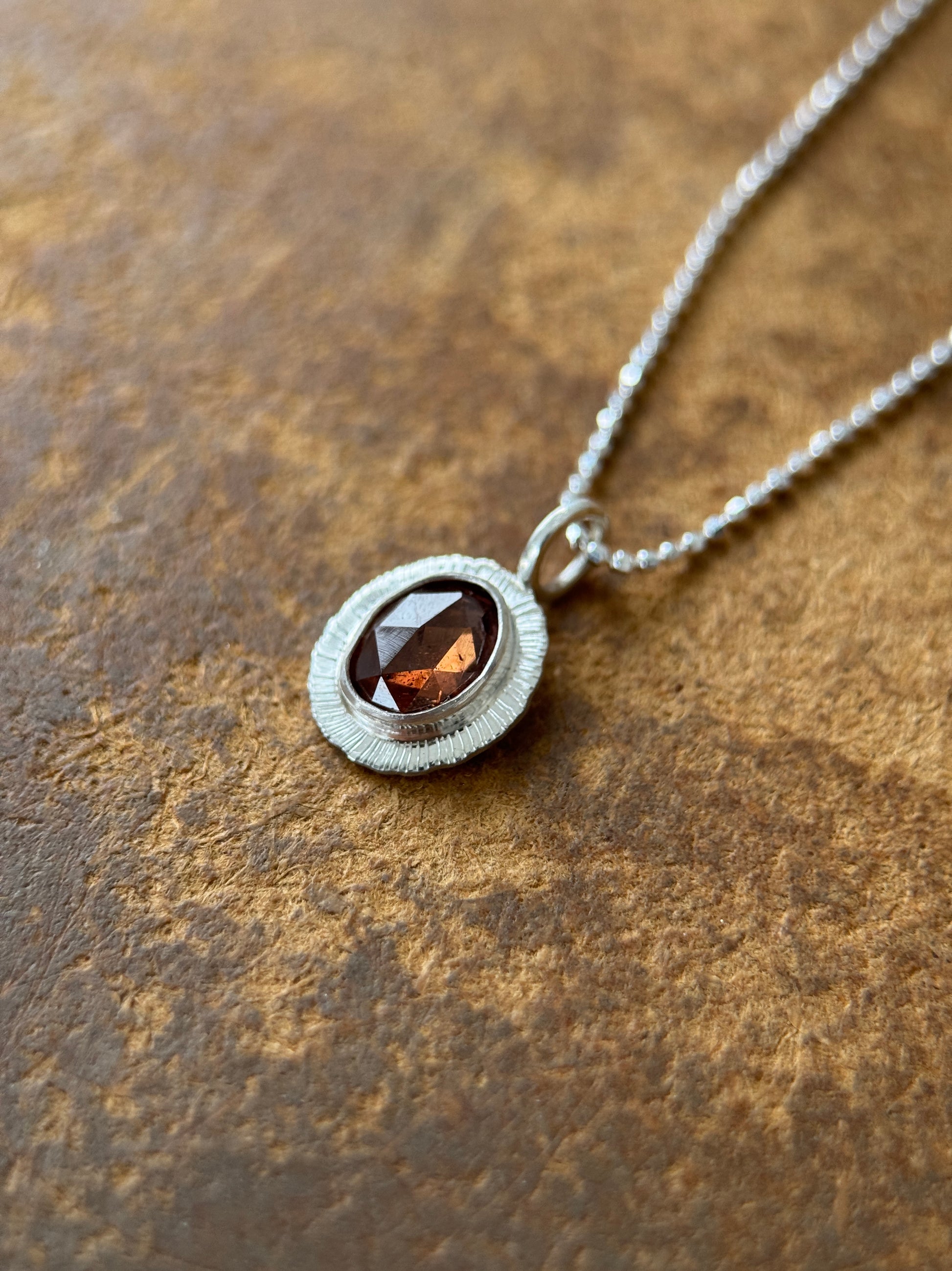A beautiful rose cut Zircon, bezel set in an open back, sterling silver pendant.