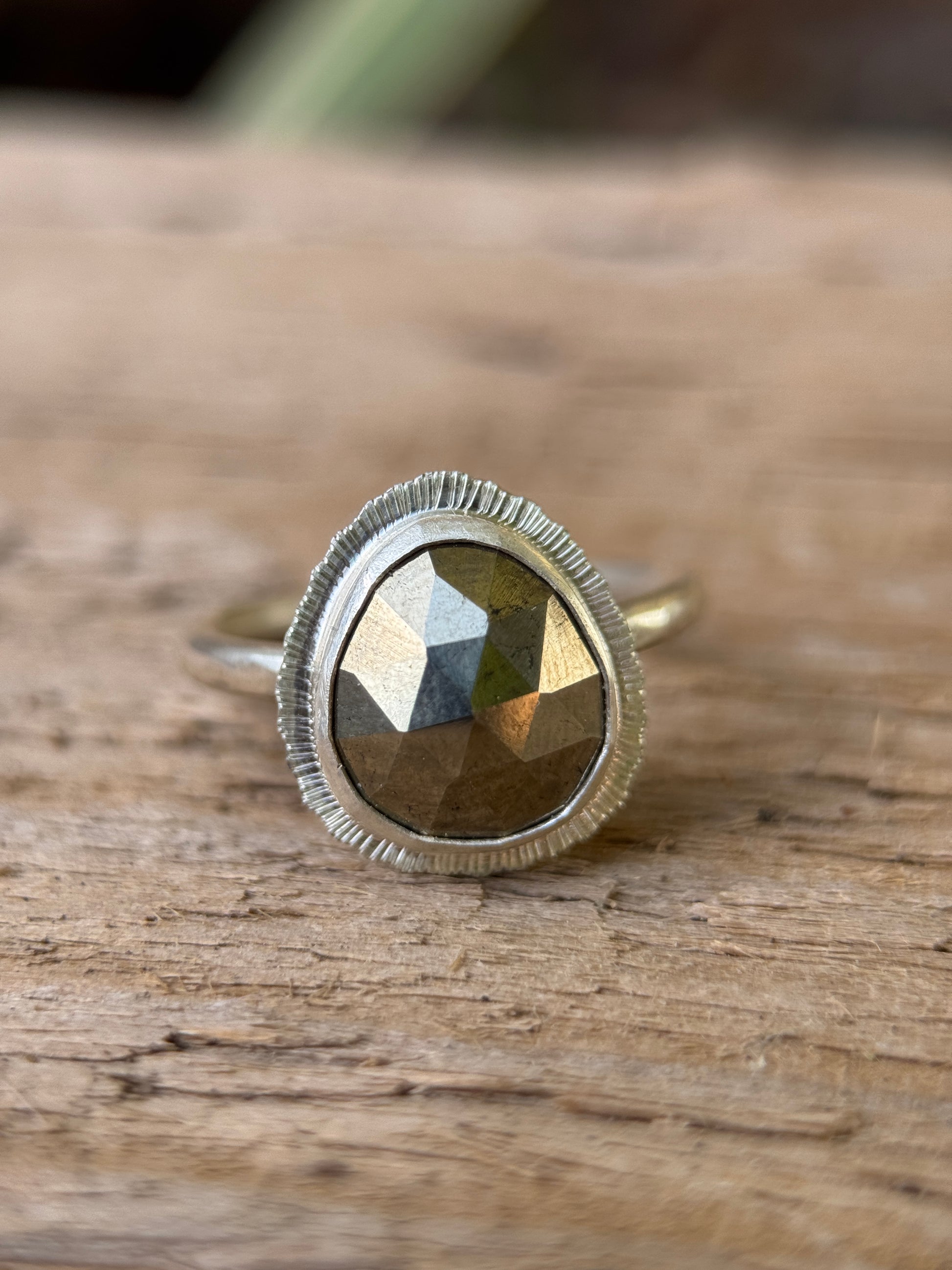 A beautiful rose cut Pyrite set in a sterling silver ring with a 2mm band.