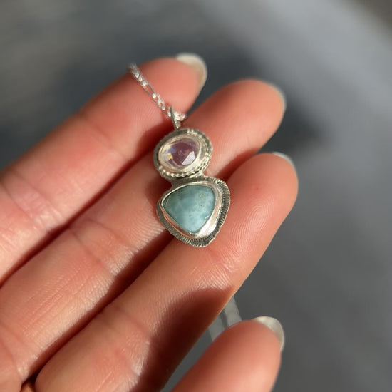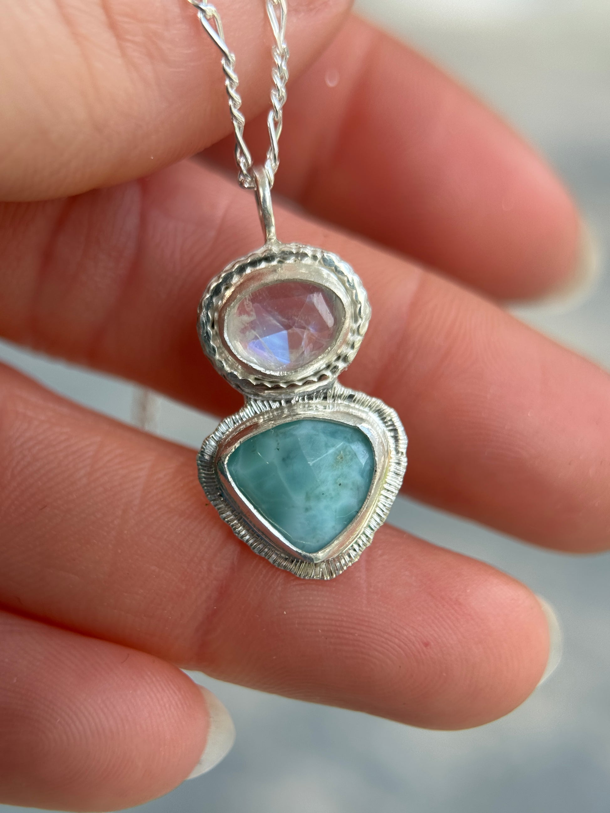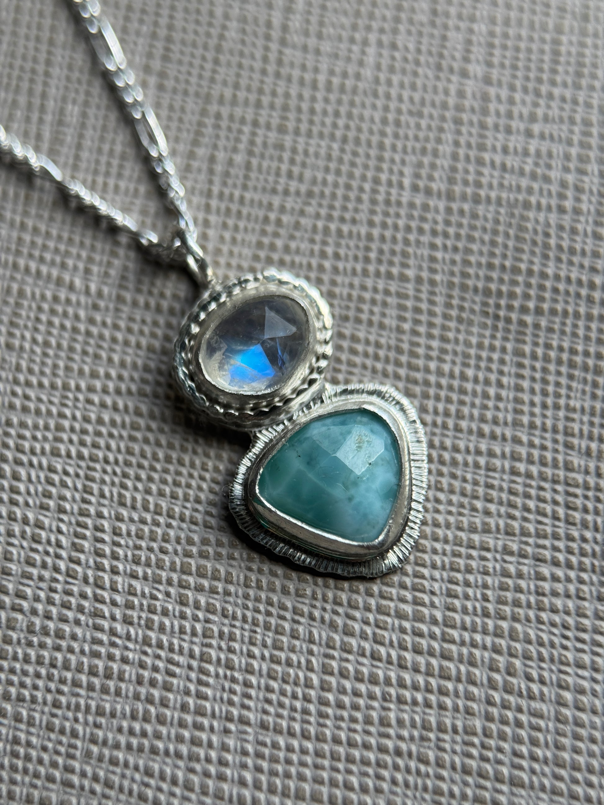 Rose cut Rainbow Moonstone and Larimar pendant in sterling silver