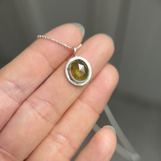 A beautiful rose cut Sphene, bezel set in an open back, sterling silver pendant.