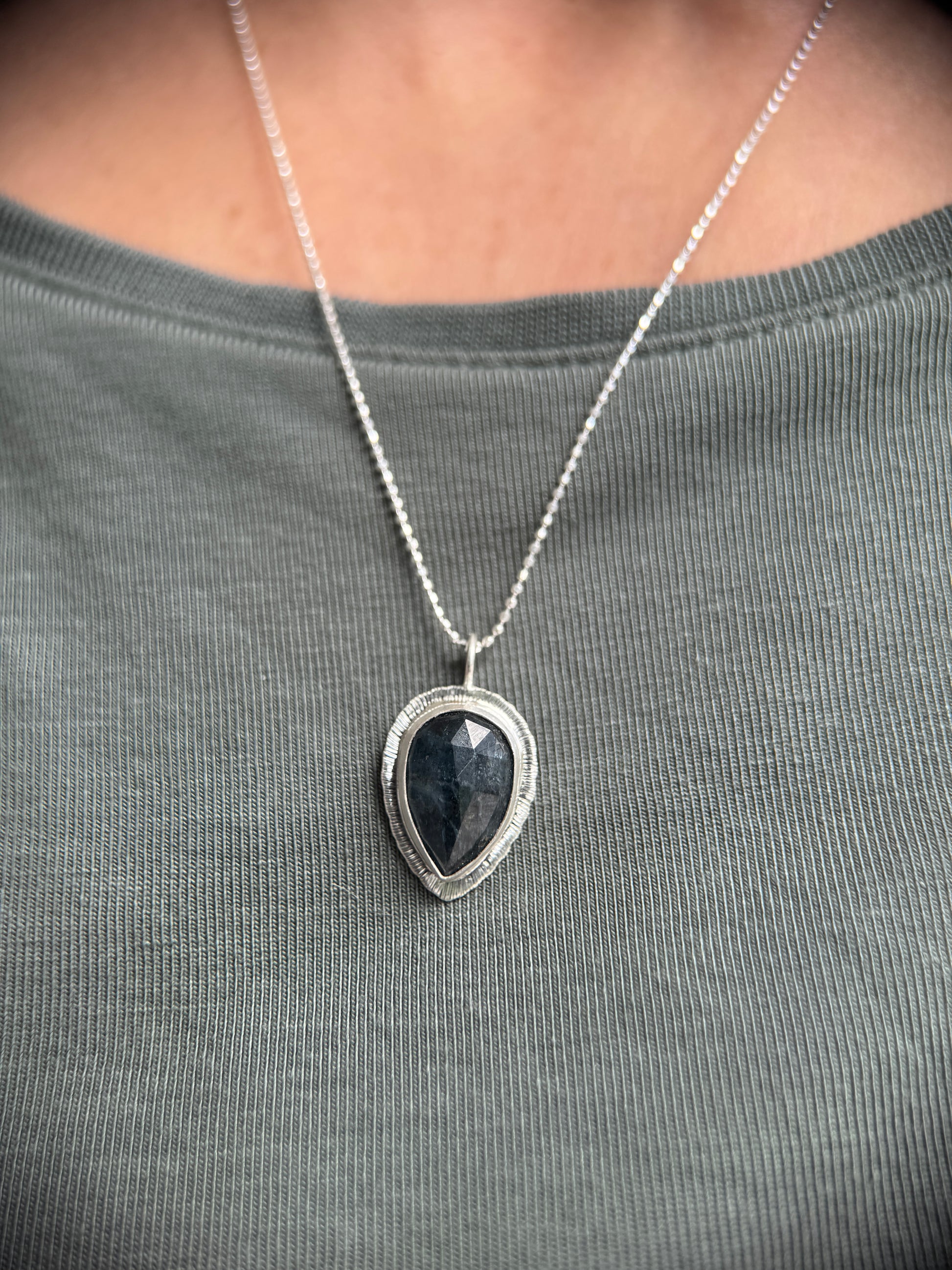 A beautiful rose cut, inverted teardrop, Teal Moss Kyanite, bezel set in an open back, sterling silver pendant.