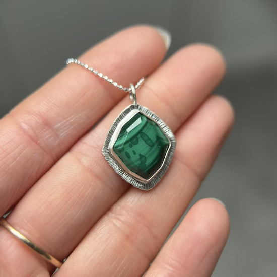 A beautiful fancy shape, step cut Malachite, bezel set in an open back, sterling silver pendant.