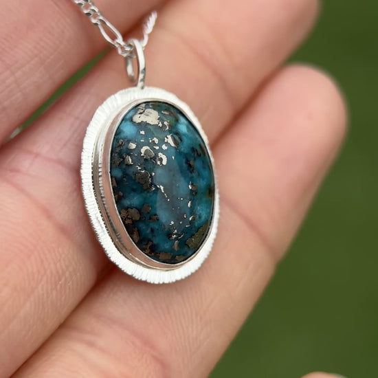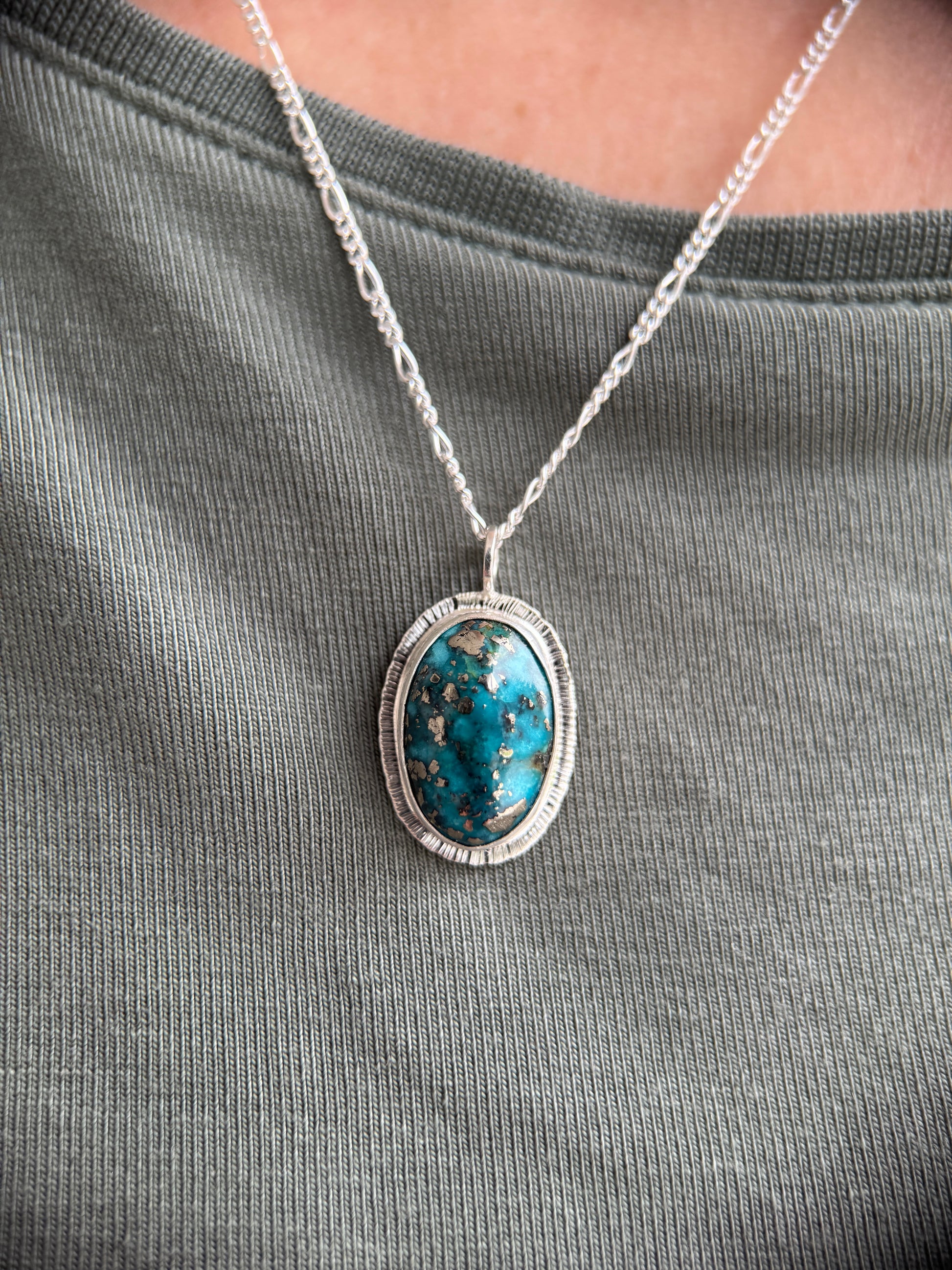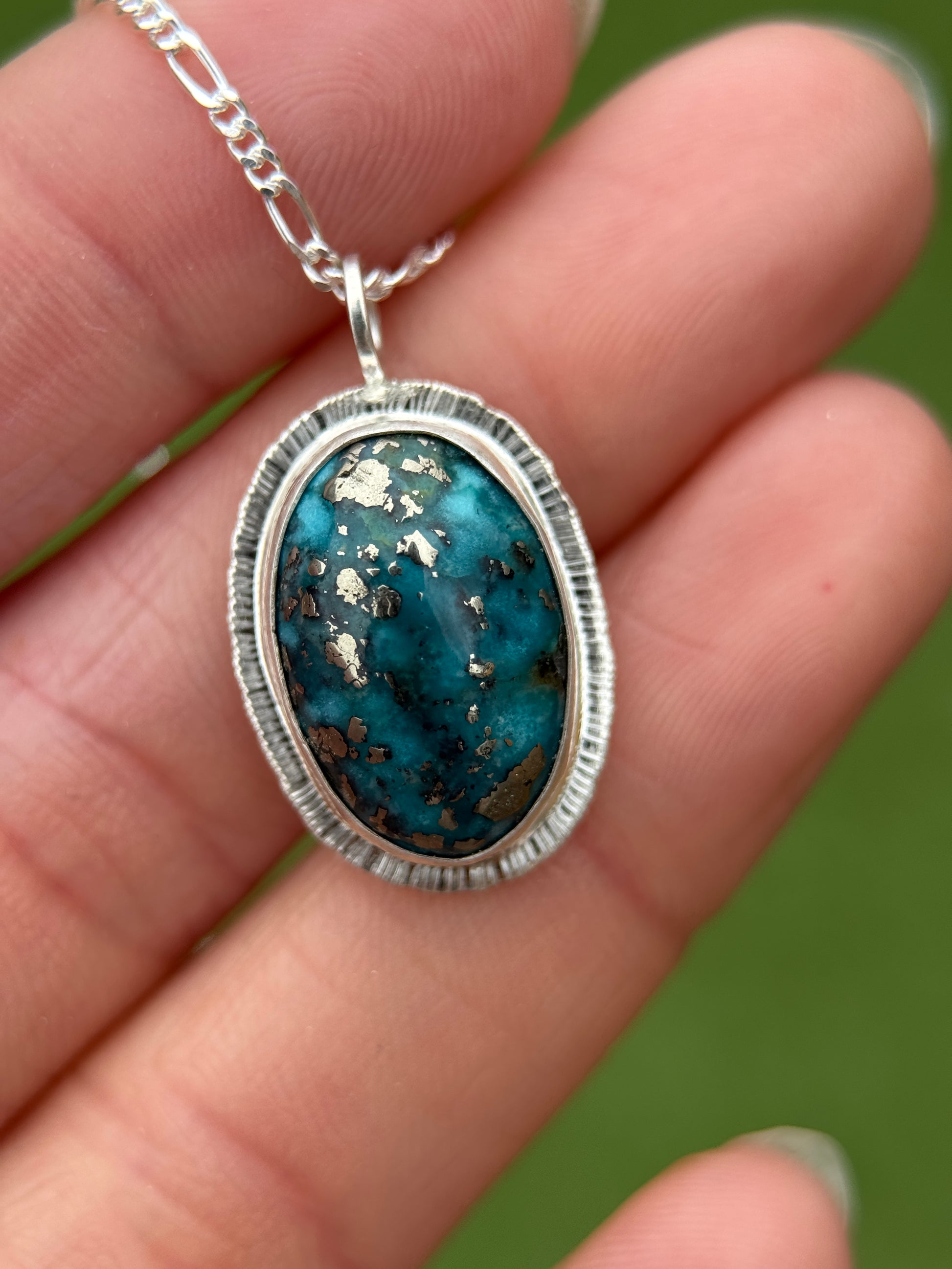 A beautiful, large, Turquoise with Pyrite inclusions, bezel set in an open back, sterling silver pendant.